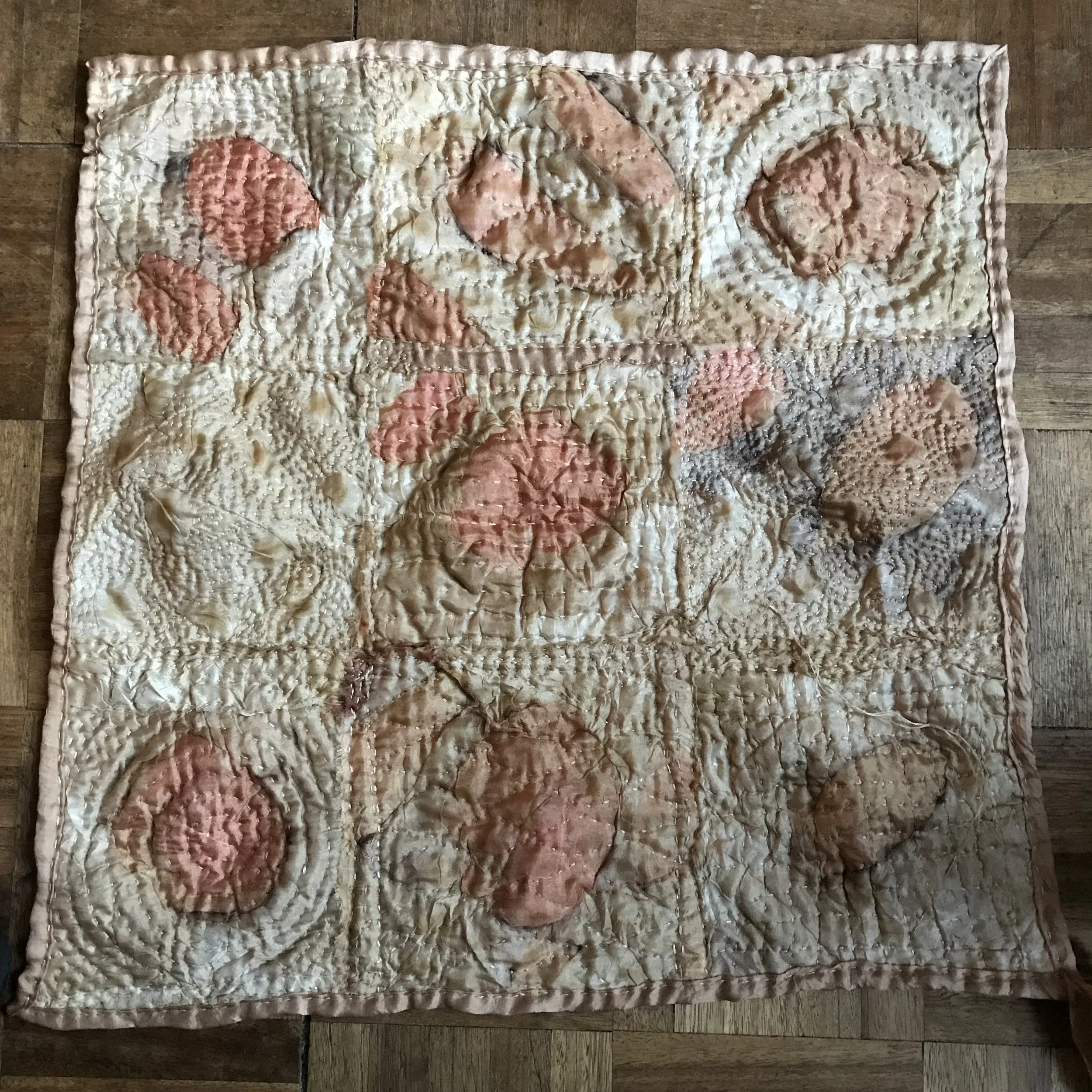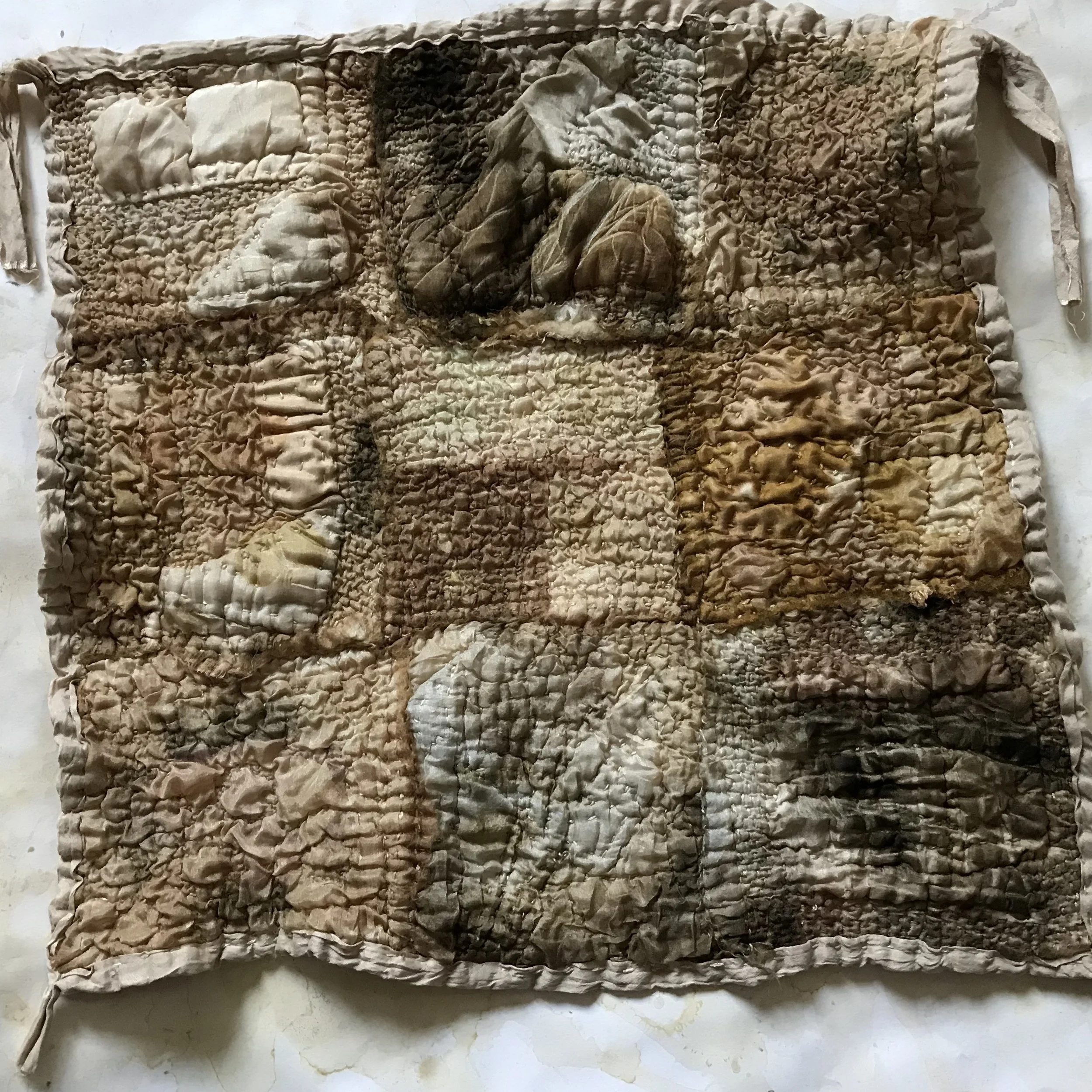 My memory cloths hold the memories of particular times and places and the people and events associated with them. They are often at least partly worked in the their place of origin. They begin life as pieces of silk sandwiched around prefelt, handstitched with shapes and ideas relating to the place. They are then ecodyed and felted.