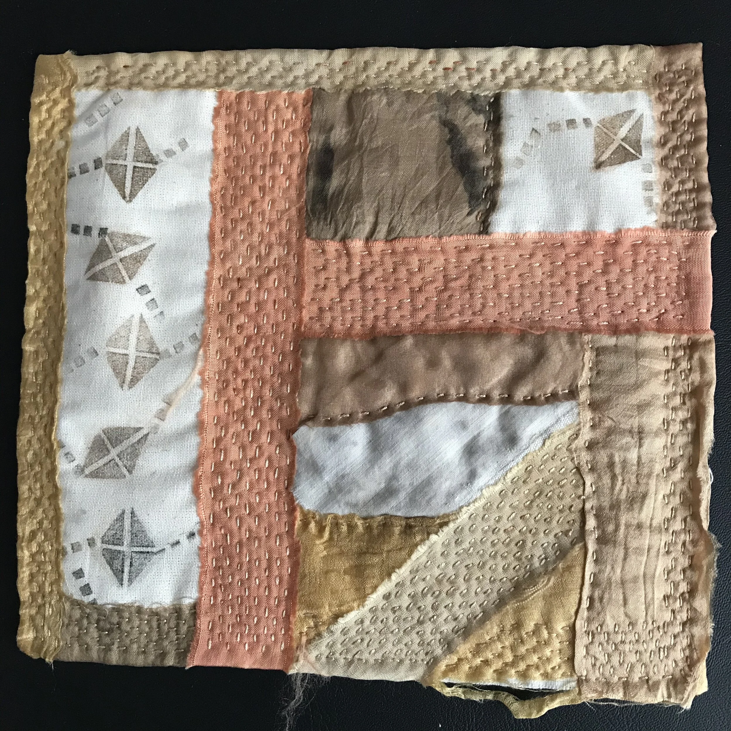 My wall hangings are made with naturally dyed and ecoprinted cloth and are hand stiitched.